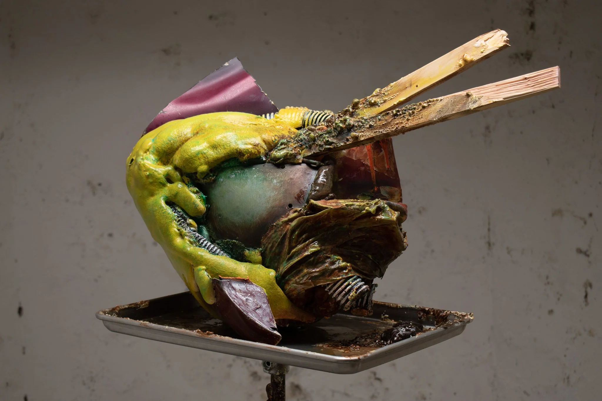 Fusing concepts from neurobiology and psychoanalysis, these biomorphic assemblages probe our collective desire for ritual and meaning. Religious symbolism from my upbringing is co-opted and redefined for the present moment, where technological advancement and ecological disaster are revealing humanity’s interconnection with the environment. Constructed from industrial detritus, the layered sculptures become power objects of everyday life, existing as altars to the sacred and profane. Electromechanical elements, such as pumps and bug zappers, animate the work, while liquids, both natural and synthetic, allow the work to evolve over time. Through their integration with the gallery infrastructure, the sculptures suggest a dependency to a larger system. What results is a worship of continual change and the connections between the human and nonhuman.